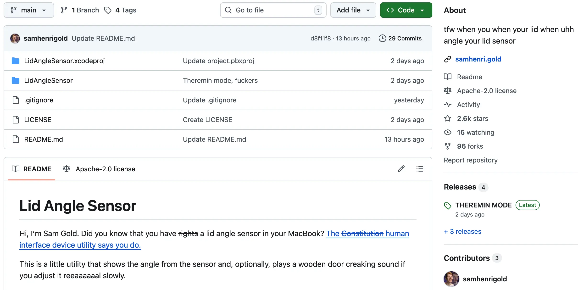 这位网友将程序上传到GitHub上供其他用户自由使用,还为其加入了音效,提供了两种声音选项:老旧门轴的转动声和特雷门琴的声音,为用户在打开笔记本时增添了几分趣味。